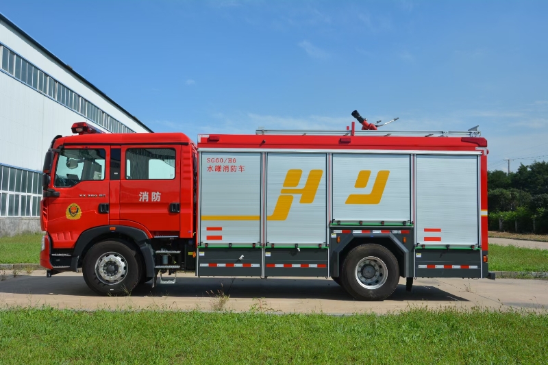 车辆底盘为豪沃ZZ5207TXFV471GF5底盘,发动机型号MC07H.35-60,功率:257kw,国六排放标准,轴距4700mm,罐体材质:采有耐低温高分子化合物PP;容罐容量:水6000kg,消防泵为上海雄真CB10/60-XZ;消防炮为PS50W。