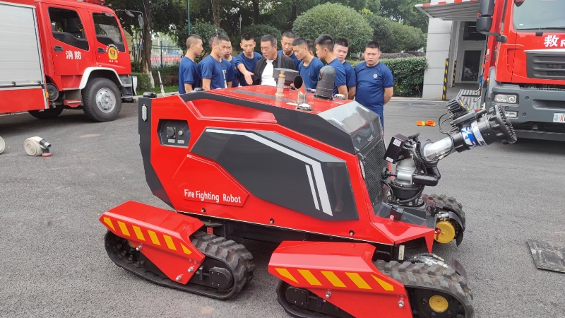 在演示活动上,我公司自主研发的全地形消防灭火机器人,通过全程智能化遥控操作,可以更好的完成现场救灾灭火任务。四履带独立驱动,可以全地形移动,360度原地调头,同时还可以实现高空出水等诸多高难度动作,具有灵活、高效、安全的特点。