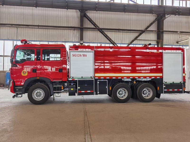 车辆底盘为豪沃ZZ5357TXFV464MF5底盘,发动机型号MC11.46-61,功率:341kw,国六排放标准,轴距4300mm+1400mm,罐体材质:优质碳钢板;容罐容量:水12000kg; 消防泵为雄真CB10/60-XZ;消防炮为威斯特PS50W。