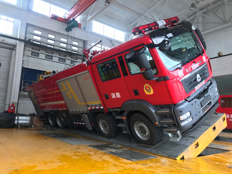 车辆底盘为汕德卡ZZ5446V516MF5底盘,发动机型号:MC13.54-61,功率:400kw,国六排放标准,轴距:1950+4500+1400mm,罐体材质:优质不锈钢304,容罐容量:水10000kg,泡沫5000kg,干粉罐额定充装量:3000kg,消防泵为8FGR-美国Hale(希尔),消防炮为泡沫水两用炮,型号为DICODOPLUS 150法国POK博克,干粉炮为萃联PF40,照明系统为星际,主照明灯功率:600W×4 整车由底盘、罐体、箱体、管路、干粉氮气系统、照明系统等主要结构组成,罐体采用优质不锈钢304。设计厚度:4:4:3(底板:侧板:防荡板);箱体主骨架为优质型钢,蒙板为优质氧化铝合金平板粘接结构。全钢框架焊接结构,左右后三侧为铝合金卷帘门,车身右后侧设上爬梯,下设防滑翻转踏板。器材箱内骨架采用铝合金型材内藏式搭接技术,可提高空间利用率和可变性,内部底板采用铝花纹板,内蒙板与框架之间采用粘接技术(无铆钉)。管路系统由外进水管路、内进水管路、出水管路、注液管路、泡沫管路、放余水管路、冷却水管路、全自动泡沫比例混合器组成。干粉罐材质为16MnR,配有装粉口、排粉口、氮气输送管和出粉管,罐内氮气输送管为环行并配多个进气阀,使气体与干粉混合均匀呈流态。